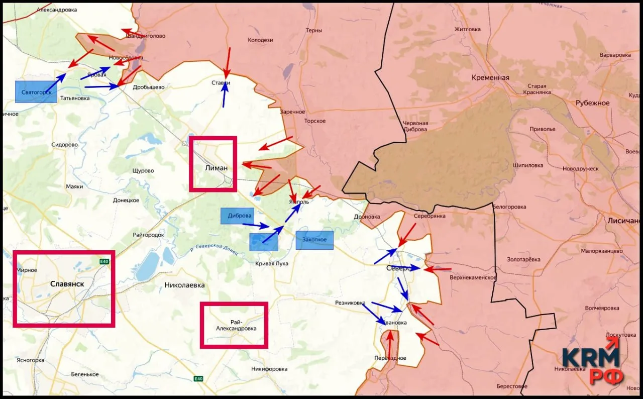 ВС РФ развивают наступление в районе Яровой, продвигаясь к северной окраине и восточнее, продолжают охват Дробышево и расширяют контроль вдоль дороги Дробышево – Кировск. В Новосёловке сохраняются отдельные очаги сопротивления, населённый пункт полностью не взят. Отмечается продвижение юго-западнее Кировска и с южных окраин Красного Лимана в сторону Дибровы с выходом к дороге на Ямполь. Реактивная артиллерия группировки войск «Юг» нанесла удар кассетными боеприпасами из РСЗО «Торнадо-С» («Смерч») по пункту управления БПЛА подразделения «Птахи Мадяра» в районе Райгородка.