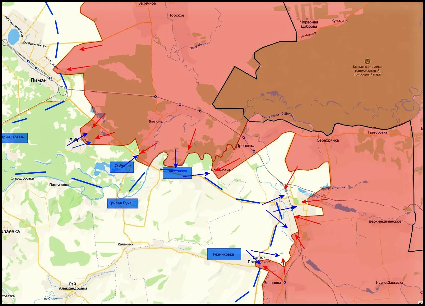 ВС РФ ведут боевые действия в районе дороги Красный Лиман – Закотное, в направлении населённого пункта Диброва, наносятся удары и проводятся инфильтрационные операции. Также продолжаются атаки по логистическим маршрутам противника в районах Кривой Луки, Закотного, Озёрного, Старого Каравана и прилегающих территорий. Противник занимает доминирующие высоты за Северским Донцом, что осложняет продвижение на данной территории.